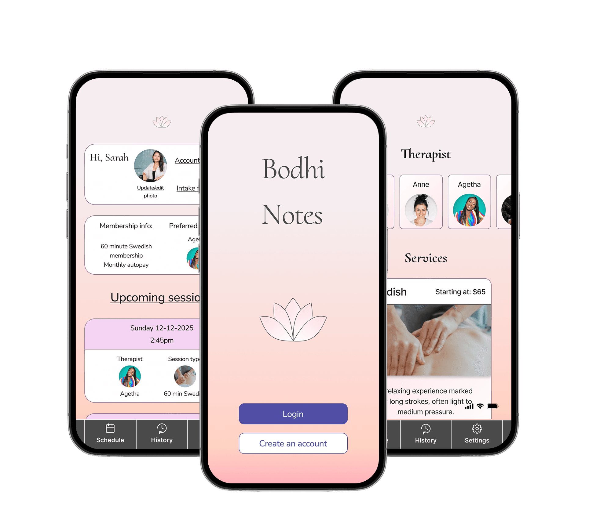 Bodhi Notes was designed following in-depth user research and prototype testing with therapists to validate real-world needs. The app uses AI to analyze intake forms and SOAP notes, generating personalized treatment recommendations alongside therapists' modalities to enhance care quality and reduce preparation time.